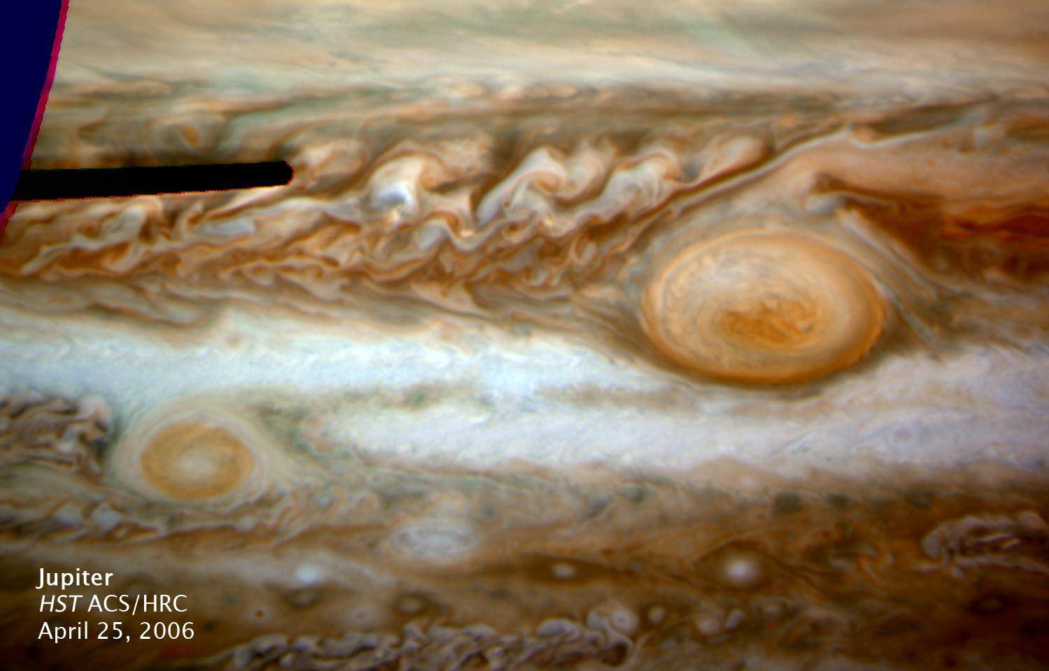 This image captures a second "red spot" (lower left) that emerged alongside the bigger and more famous Great Red Spot (right) on Jupiter. The new storm is roughly one-half the size of the Great Red Spot. Some Hubble images use data acquired over several days of observations.