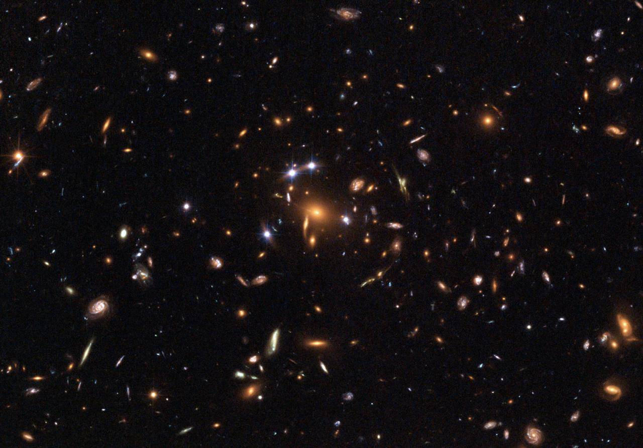 This picture captures a galaxy cluster called SDSS J1004+4112 that's so massive that its gravity bends light from galaxies behind it. The light of a distant quasar (the brilliant core of an active galaxy) has been bent around the cluster, appearing in five places in this image.