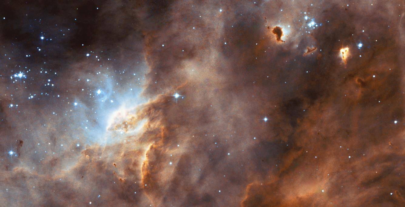 This panoramic view captures an iridescent tapestry of star birth, filled with glowing gas, dark dust clouds, and young, hot stars. The star-forming region, cataloged as N11B, lies in a nearby galaxy, the Large Magellanic Cloud.