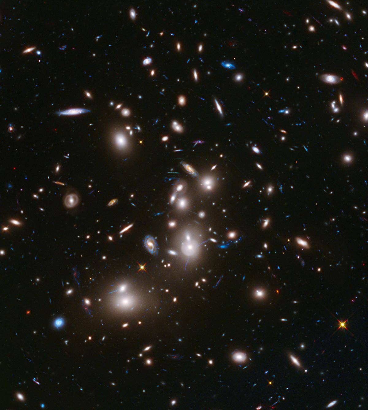 Located 3.5 billion light-years away, Abell 2744 contains several hundred galaxies and might be a pile-up of at least four smaller galaxy clusters. Abell 2744’s strong gravitational field acts as a lens, brightening and magnifying the light of nearly 3,000 distant background galaxies.